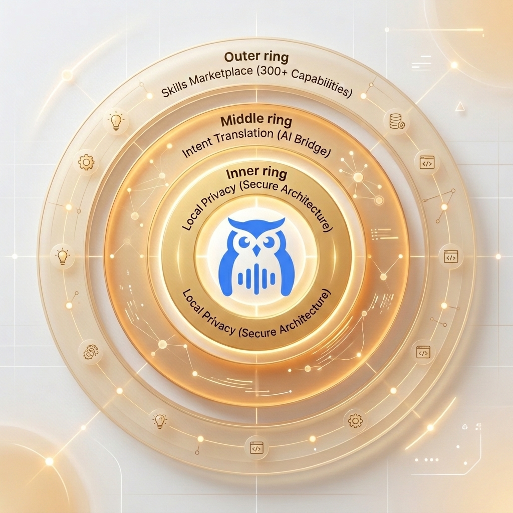 The Owlfy Skills Marketplace is the extensibility layer that gives Owlfy its range. Professional-grade capabilities — 3D modeling, AI image generation, video production, smart home control — are packaged as installable skills that require no technical knowledge to activate.