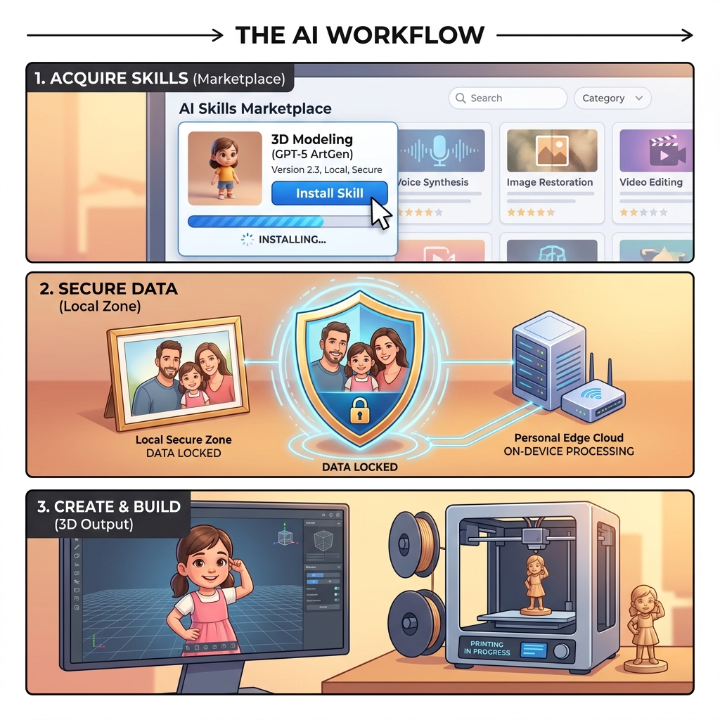 Professional Capability for EveryoneThe Skills Marketplace packages professional tools — 3D modeling, image generation, video processing, smart home control, code generation — as installable skills that anyone can activate with a copy-paste.