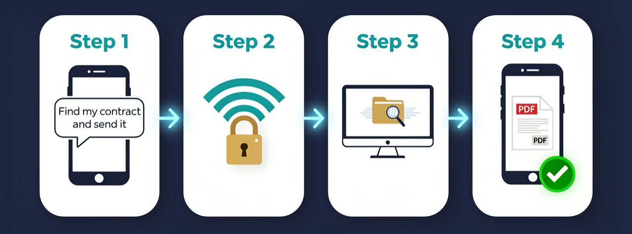 - With Owlfy: you open WhatsApp, send one message — "Find my latest contract file and send it to me" — and within seconds your phone receives the file.+ Before Owlfy: you'd have to call a colleague, drive back, or apologize and delay.