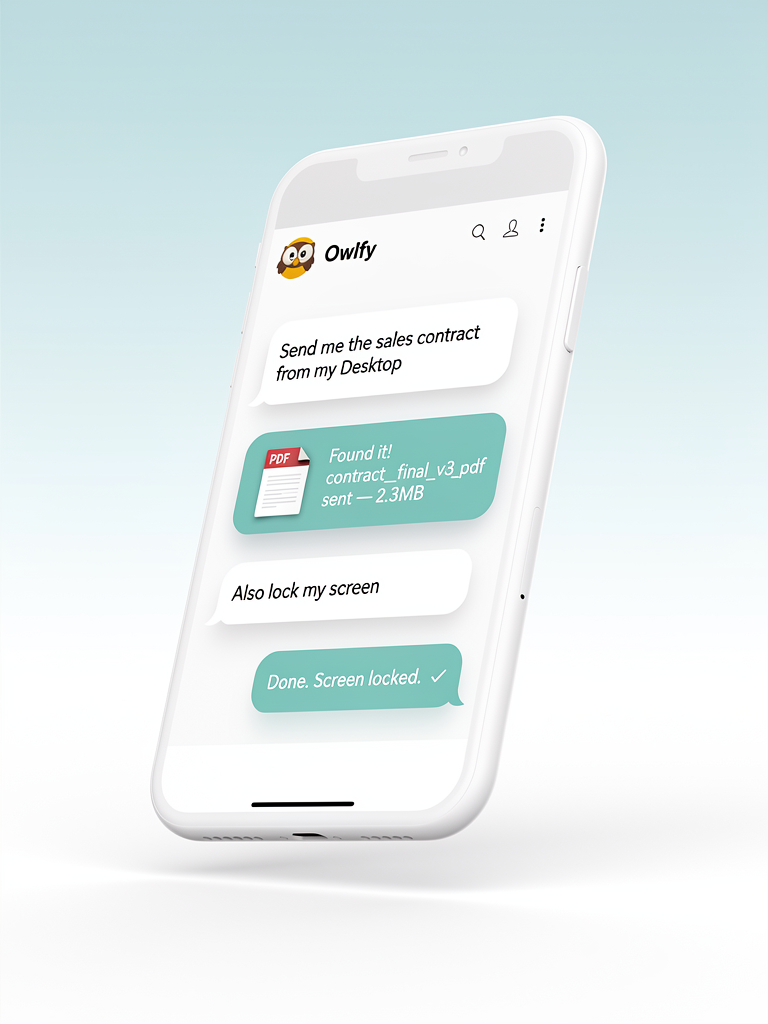 + With Owlfy: you open WhatsApp, send one message — "Find my latest contract file and send it to me" — and within seconds your phone receives the file.
