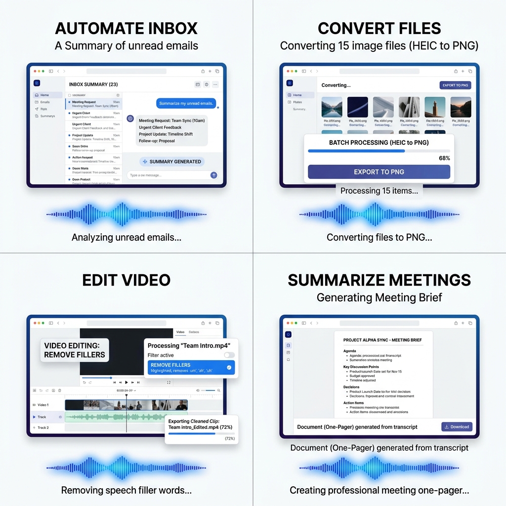 Convert files in bulk across any format (docx to pdf, jpg to png, mov to mp4). Merge multiple documents. Organize folders by file type. All by voice.